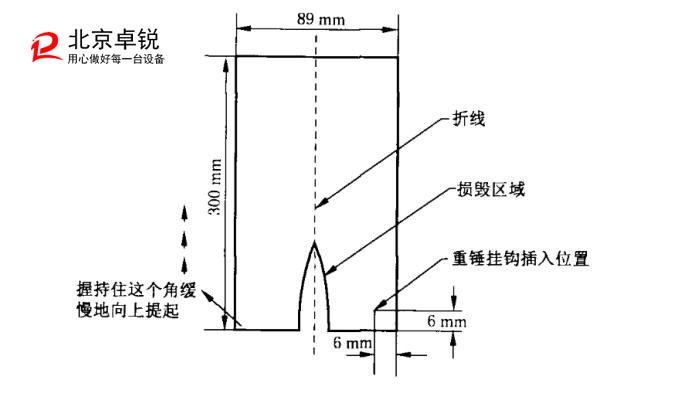 損毀長度的測定:先沿損毀長度方向炭化處對折一下,然后在試樣下端燒焦區的一側,距其底邊及測邊各約6mm處懸掛已選定的重錘。將試樣平放在桌面上,抓住燒焦區未掛重錘的一端,緩緩提起試樣并離開桌面,使重錘懸空,以使試樣在自然狀態下從損毀處裂開(為了提高測量的準確度,防止撕裂方向的改變,可在炭化中心處先剪一段距離),裂縫逐步增大,直到不開裂為止。放下試樣,測量試樣撕裂端到末端的距離即為損毀長度(也稱炭長,精確到1mm)。